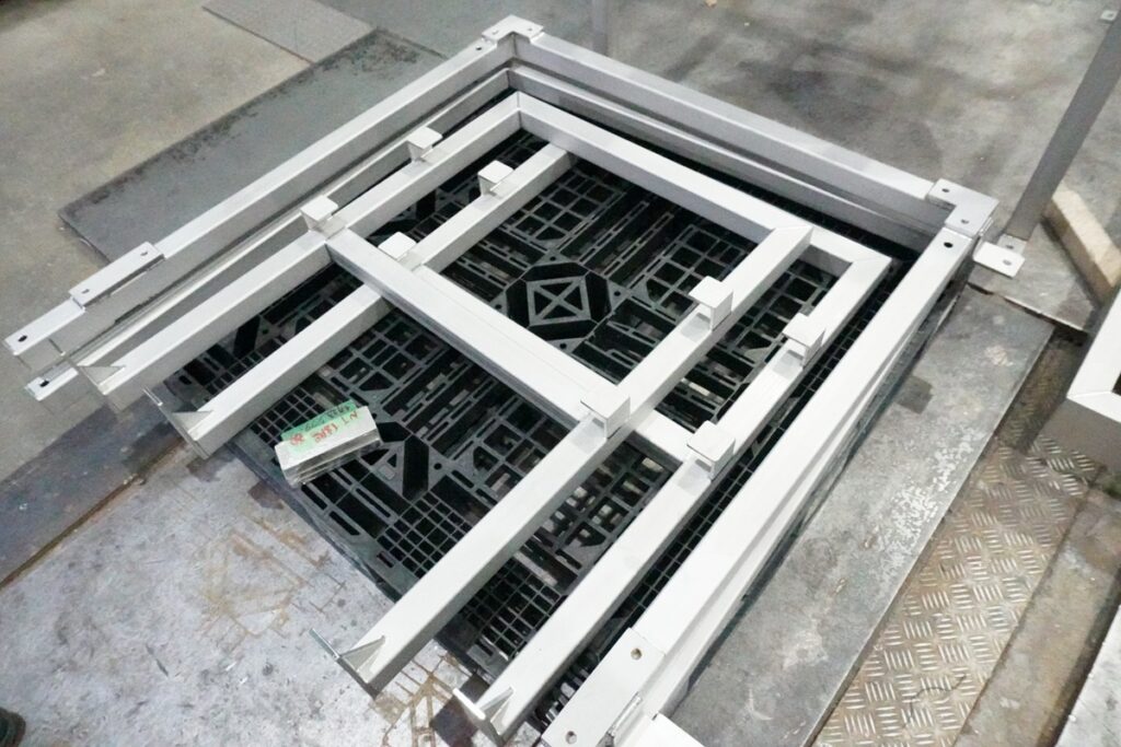 こちらは食品工場に納品予定の架台です。骨組みだけのシンプルな作りが多いですが、これはフタがついていますね。